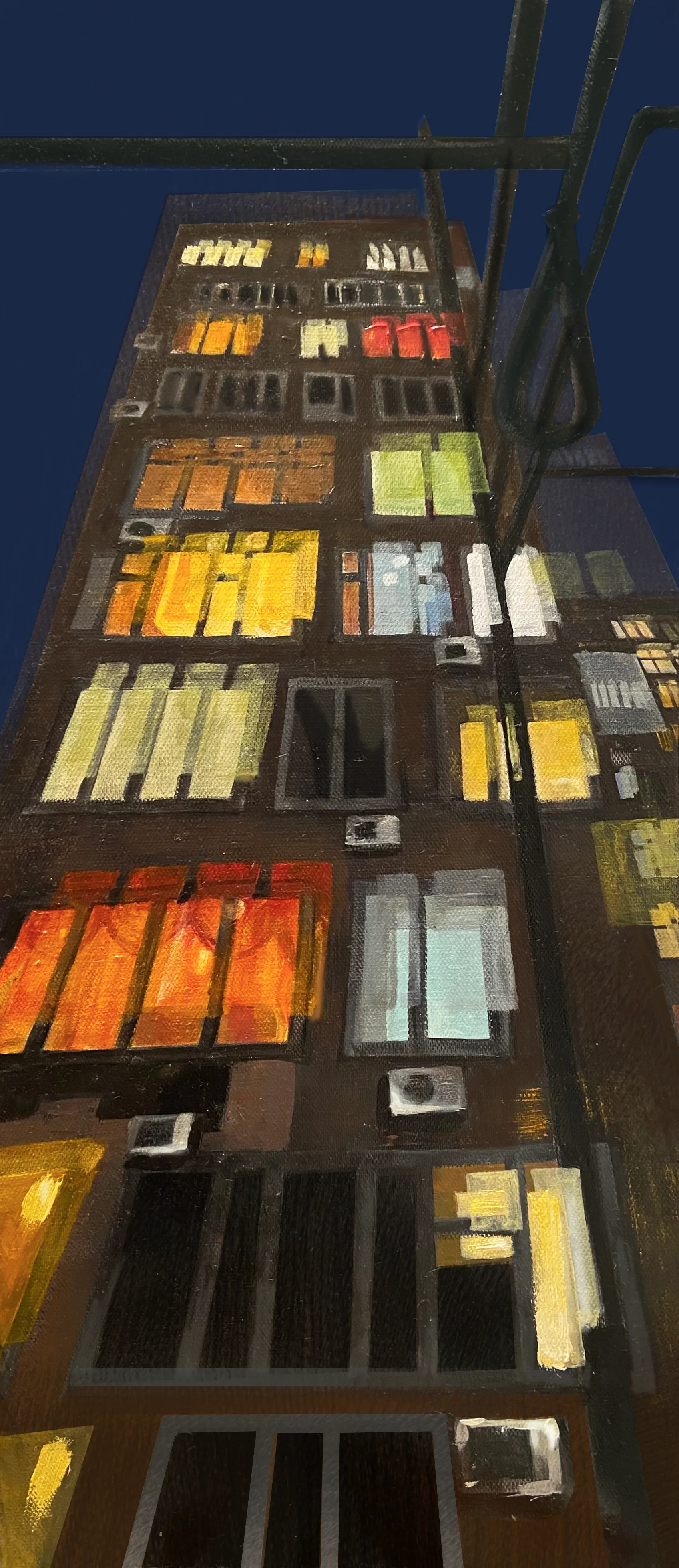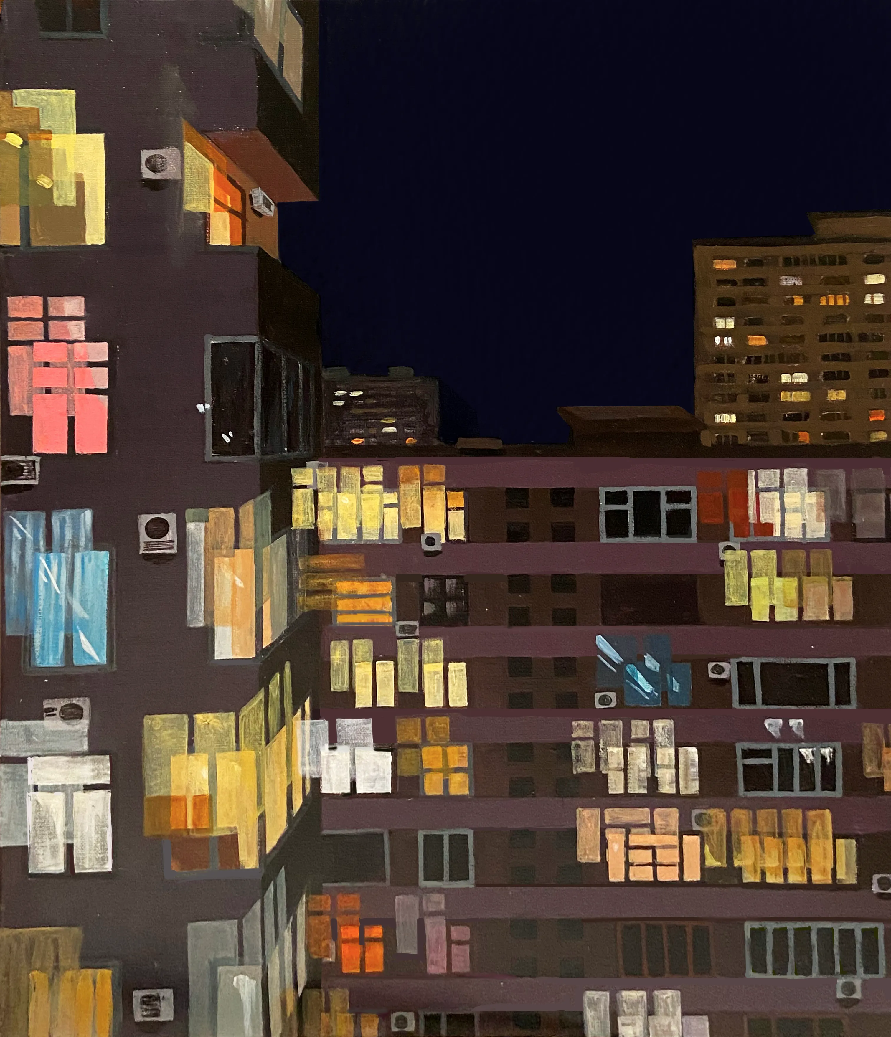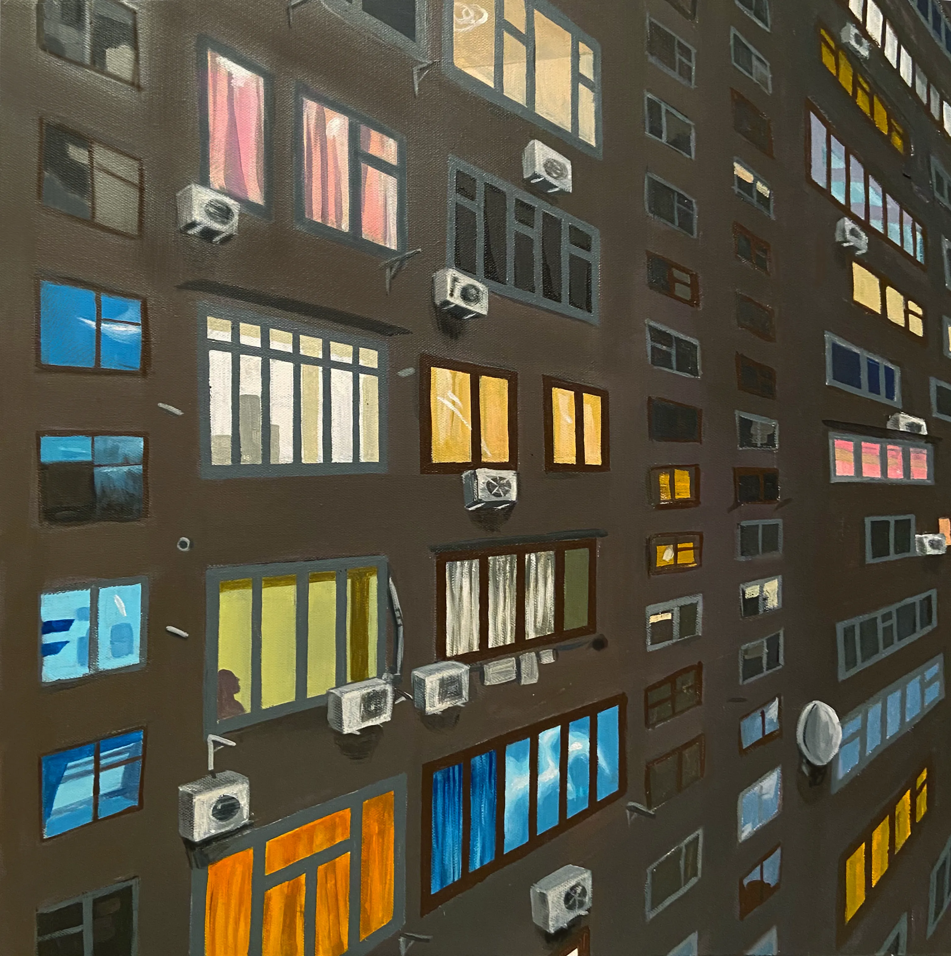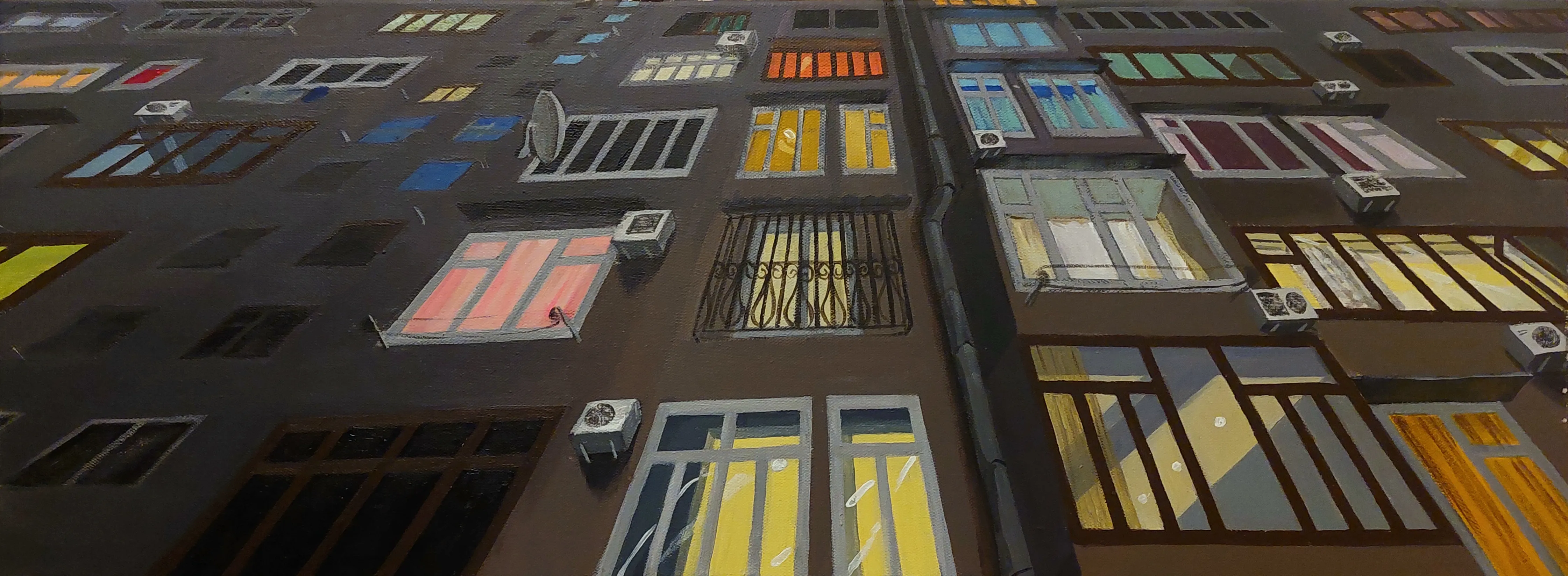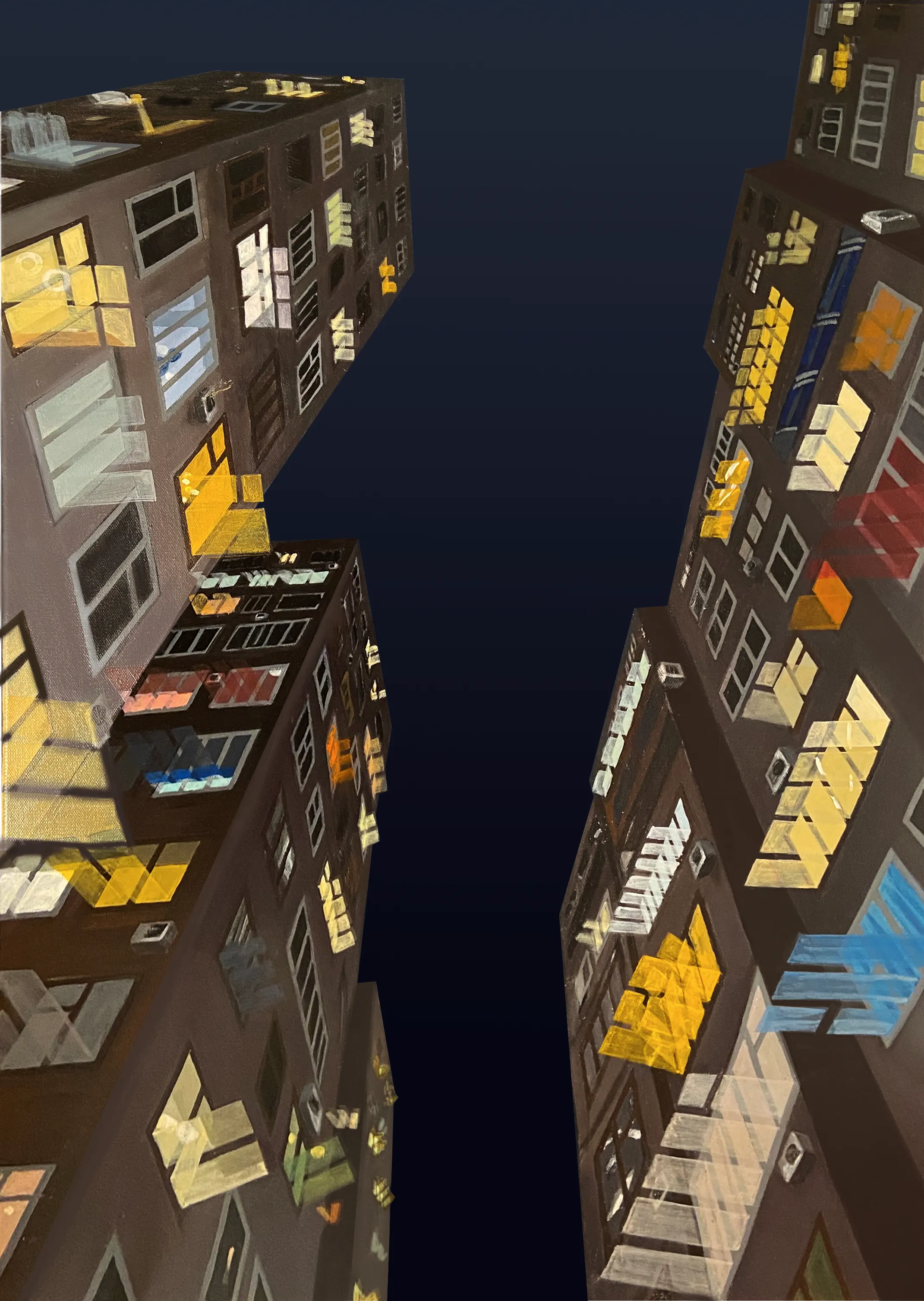 The series "Dizziness" explores the interplay between urban landscapes and the human experience. The paintings depict city buildings with suspended windows, contemplating the disorienting nature of modern urban life and its impact on our perception of reality.